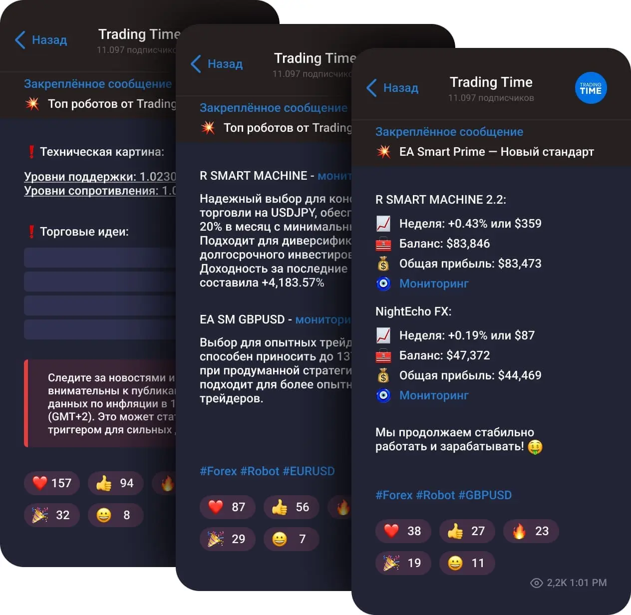 Вместе с доступом к нашим роботам вы получите доступ в эксклюзивное сообщество в Telegram, где ежедневно публикуются торговые рекомендации, стратегии, статистика по роботам, эксклюзивные предложения и скидки, а также происходит живое общение участников и помощь начинающим трейдерам.